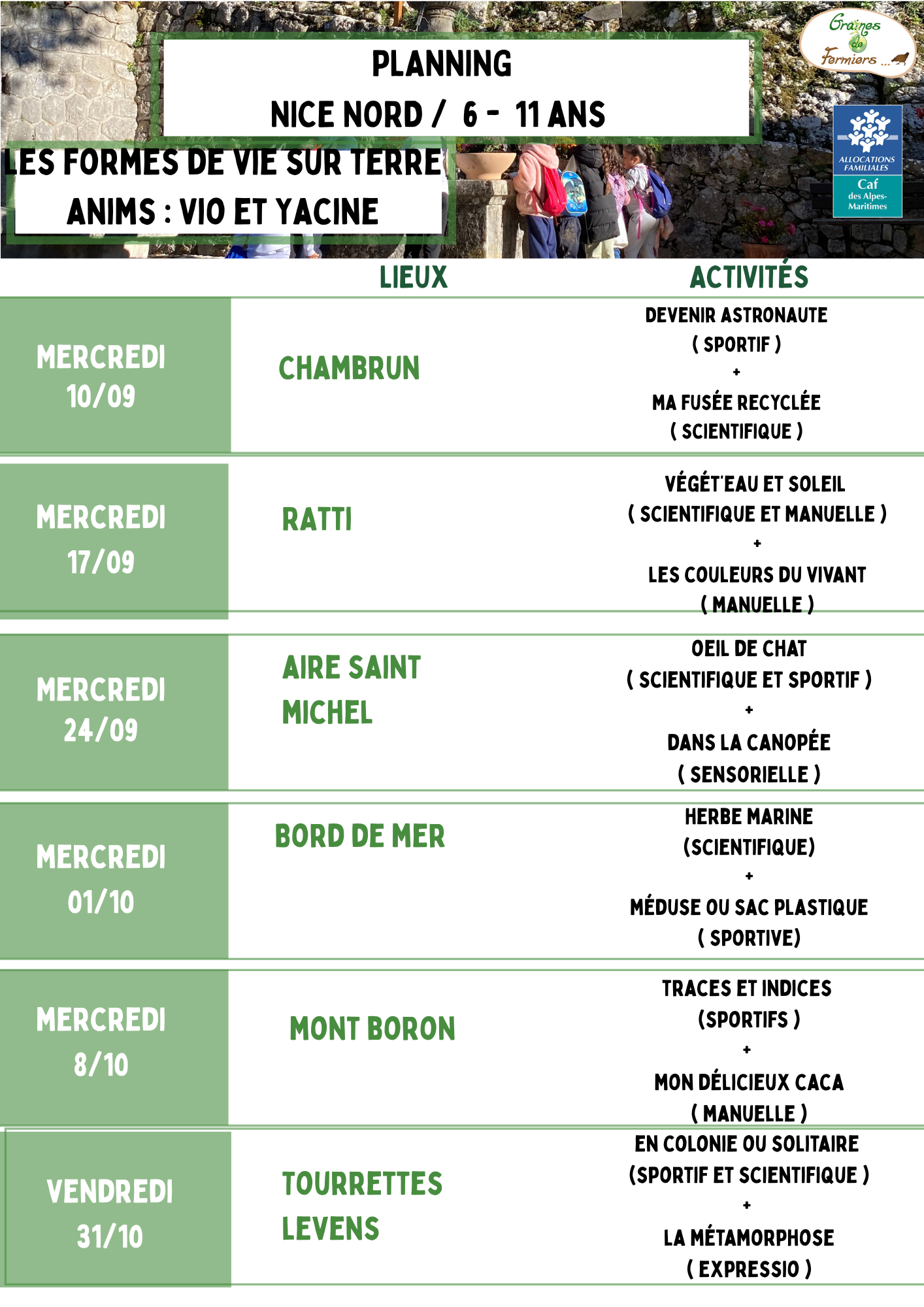 Planning Nice St Antoine : mercredis septembre et octobre 6-10ans
