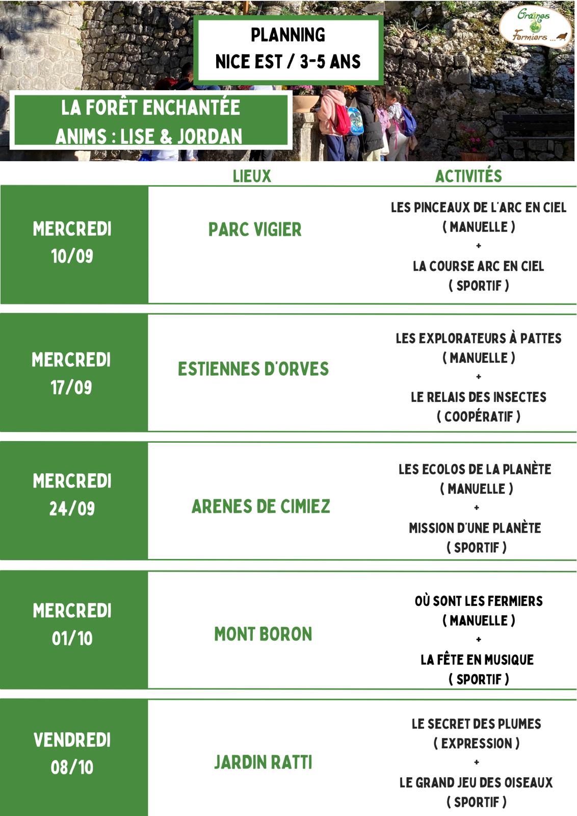 Planning Nice Est : mercredis septembre et octobre 3-5 ans