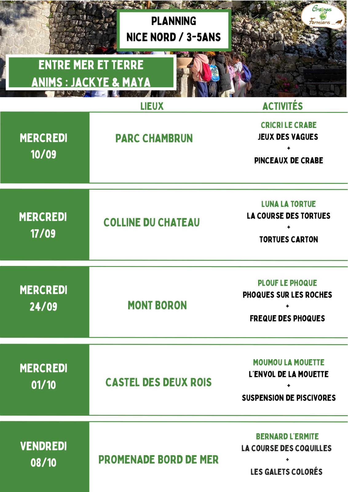 Planning Nice Nord : mercredis septembre et octobre 3-5 ans